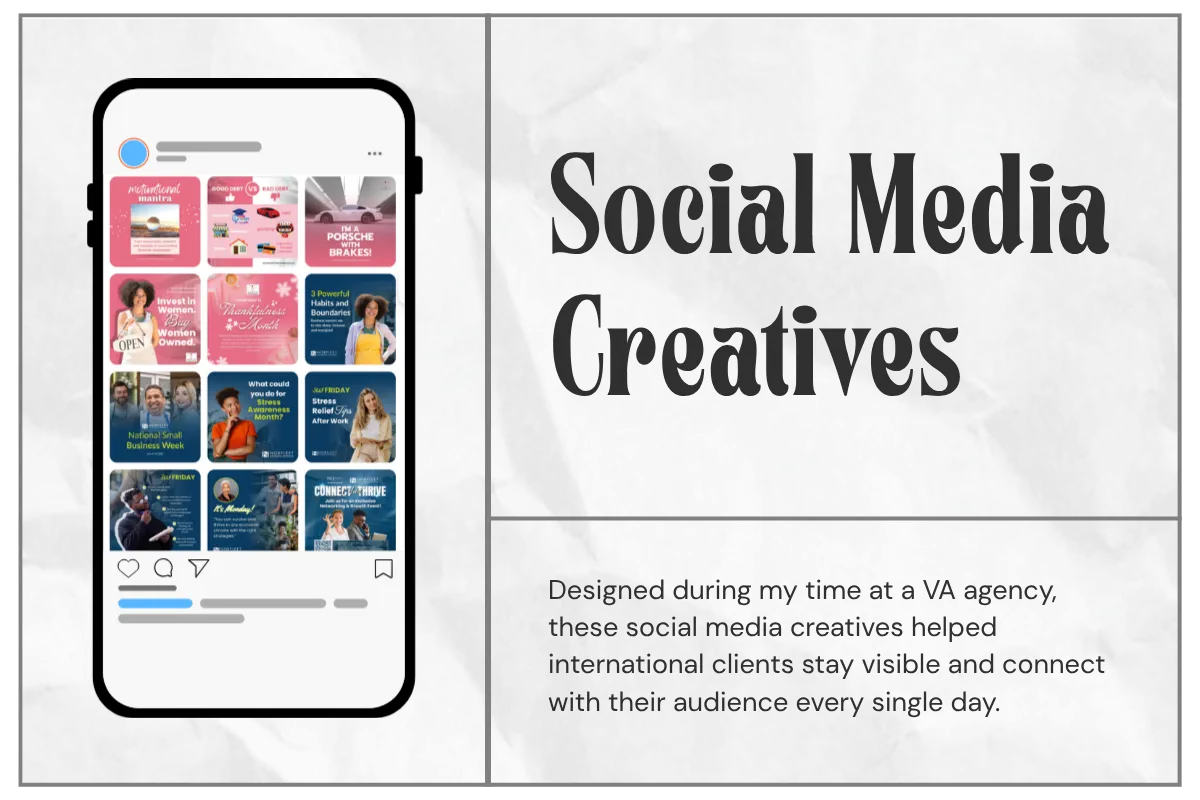 In my role as a social media content creator at a virtual assistant agency, I designed social media posts for international clients. I created content to ensure their businesses remained active and highly visible.